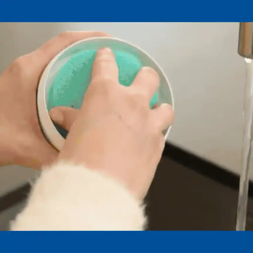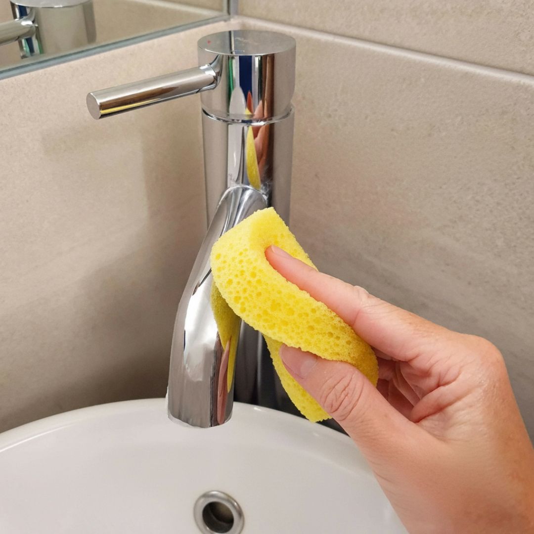 بس بللي الإسفنجة شوي، خذي كمية بسيطة وبلّشي بالتنظيف، وامسحي بقطعة قماش جافة.