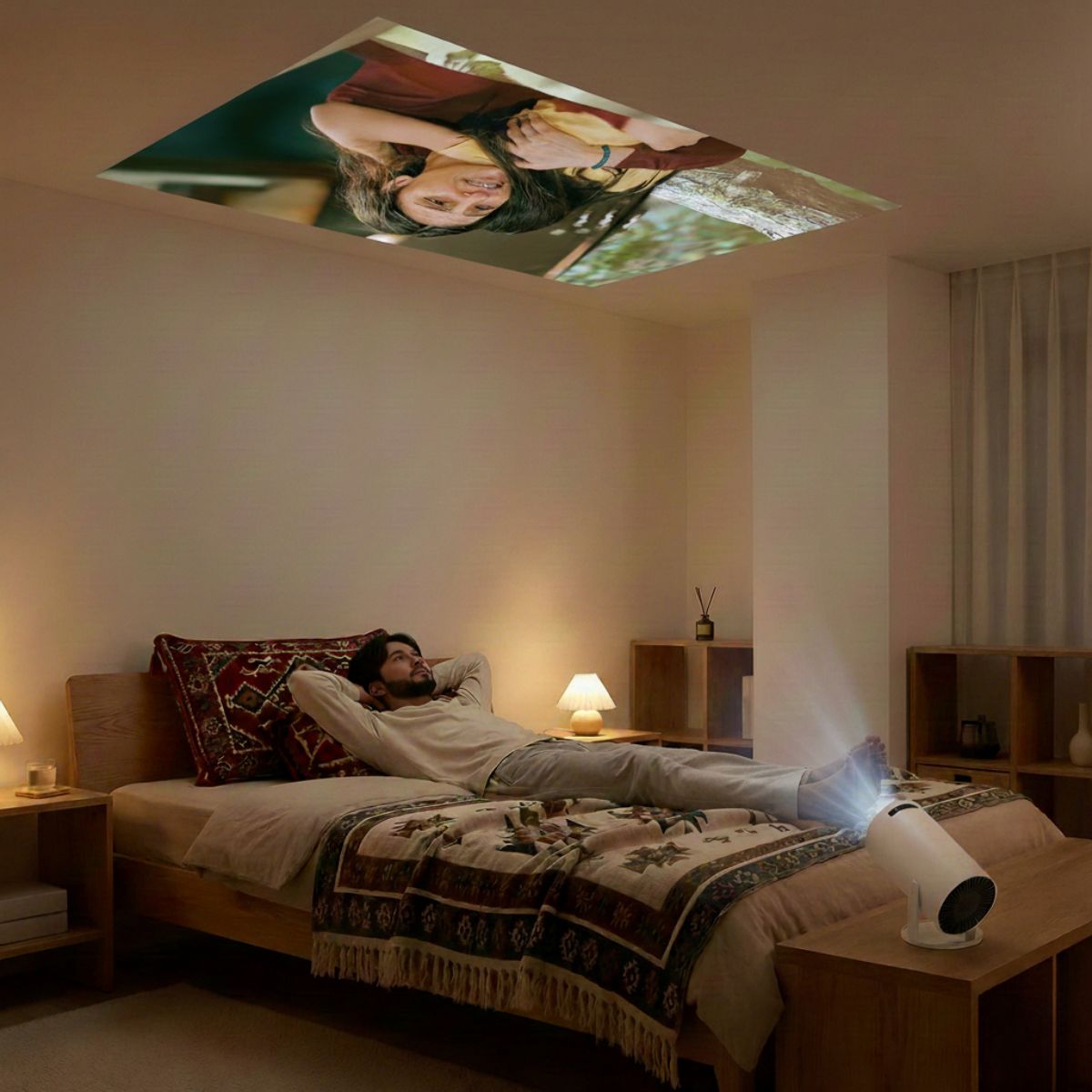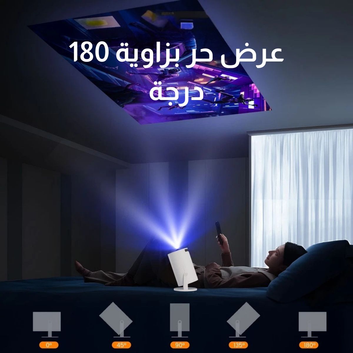 الجهاز يدور 180 درجة، يعني تكدر تعرض الصورة عالسقف وتتفرج وانت متمدد بمنتهى الراحة.